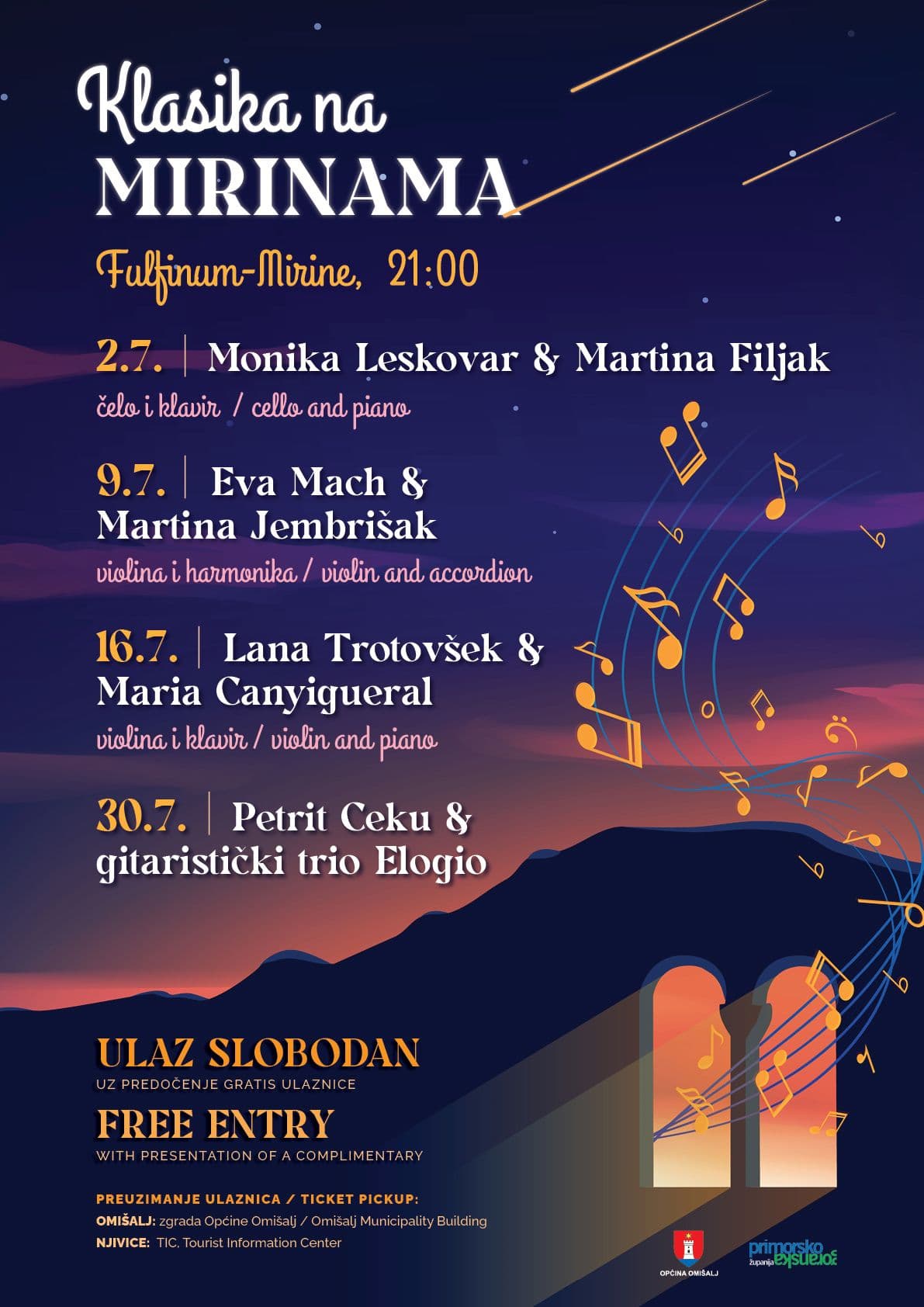 Zbog vrlo nestabilnih vremenskih uvjeta, večerašnji koncert (subota, 2. kolovoza), neće se održati na lokalitetu Fulfinum-Mirine, već u prostoru Društvenog doma Omišalj (Pušća 121).